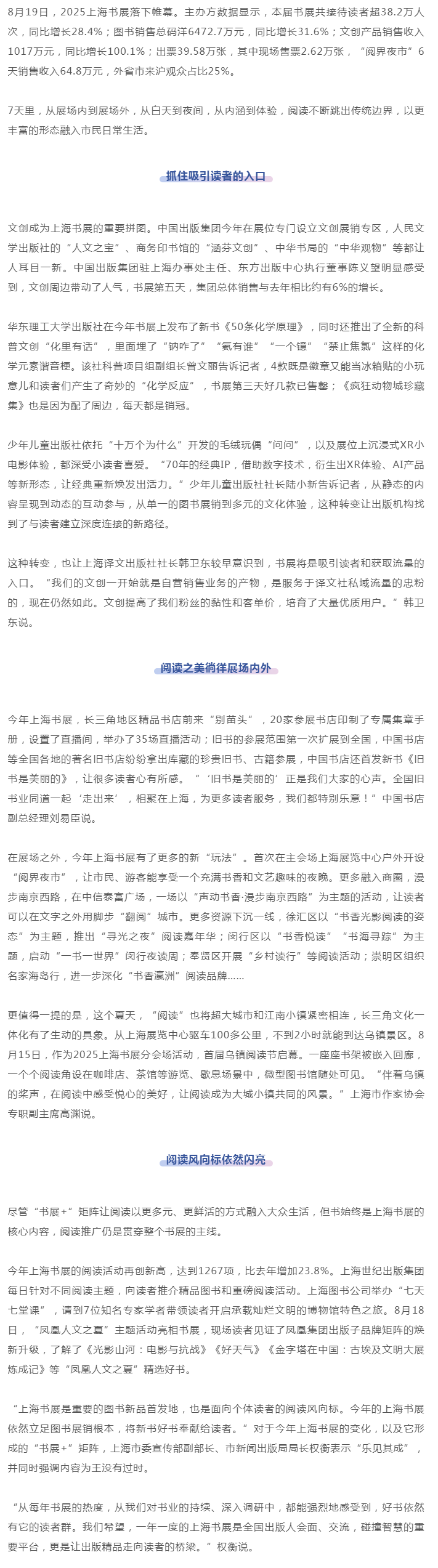 8月19日,2025上海书展落下帷幕。主办方数据显示,本届书展共接待读者超38.2万人次,同比增长28.4%;图书销售总码洋6472.7万元,同比增长31.6%;文创产品销售收入1017万元,同比增长100.1%;出票39.58万张,其中现场售票2.62万张,“阅界夜市”6天销售收入64.8万元,外省市来沪观众占比25%。