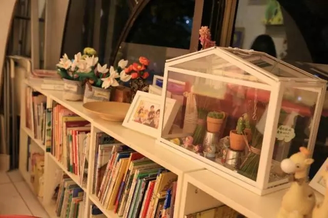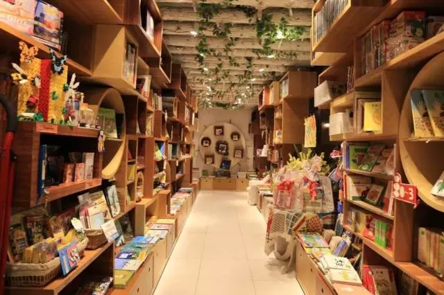 外面是三面大玻璃墙,里面玲琅满目的书,装饰品还有小朋友的手作一览无余。进入馆内,货架有着不规则方形圆形的堆叠,放满了数不清的绘本。