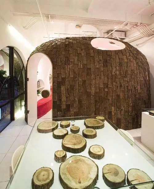 天花板是刷白的水杉树吊顶,挂着很多玩具,花卉和手作。不由得让你感受着树木自身拥有的生命感且与日月流光相衬的那份神秘感。