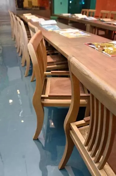 独家定制原木桌椅,色泽浑厚,与绘本馆的设计浑然一体,别有一番风味。